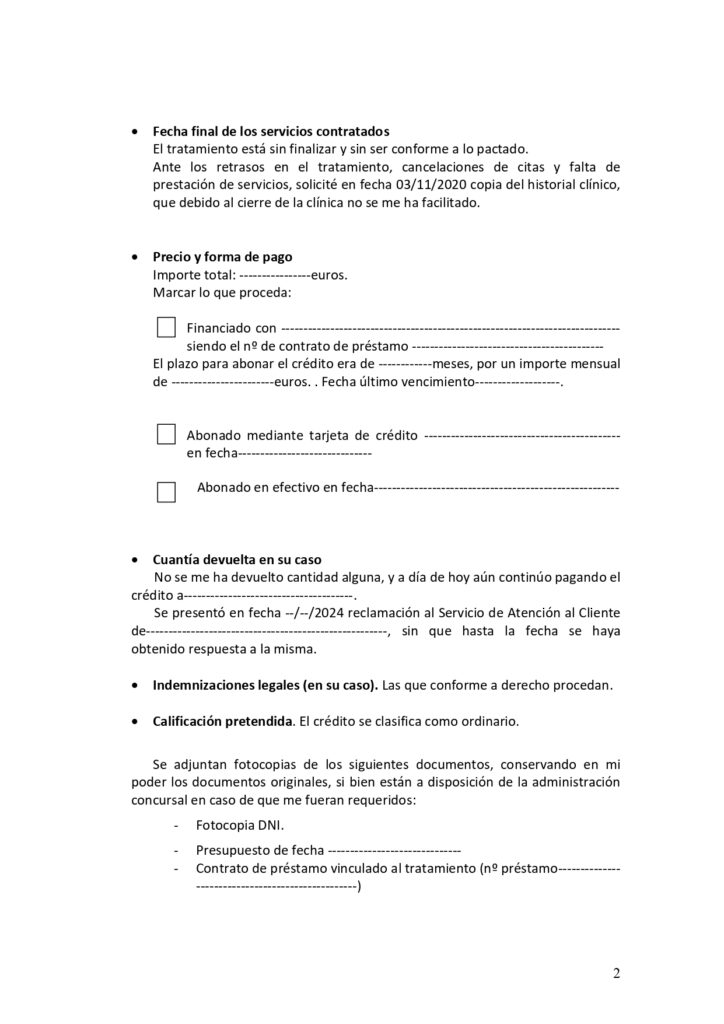 Si además estos tratamientos han sido financiados, las personas afectadas deben presentar reclamación ante la entidad financiera, con el fin de solicitar la paralización del cobro de los recibos por el cese de actividad de la empresa, así como la devolución de otras cantidades abonadas si el tratamiento no se ha efectuado.