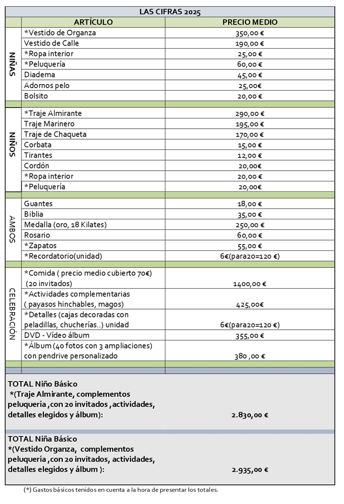 En ambos casos el precio básico medio de la Primera Comunión se encuentra entre los 2.800 y los 2.900 euros (niño/niña).