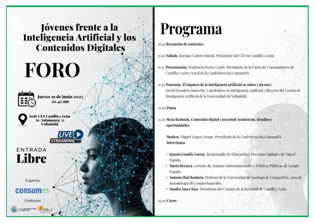 Presentamos un nuevo Ciclo de foros organizado por ConsumEs que se va a celebrar en Valladolid, bajo el título:  “Jóvenes frente a la Inteligencia Artificial y los Contenidos Digitales”.